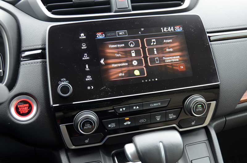 Тонкие передние стойки, большие зеркала заднего вида – с обзорностью у водителя CR-V нет ни малейших проблем. Широкий подлокотник между передними креслами двигается вперед-назад. Материалы отделки салона хороши, но вставки «под дерево» выглядят неуместно и старомодно.